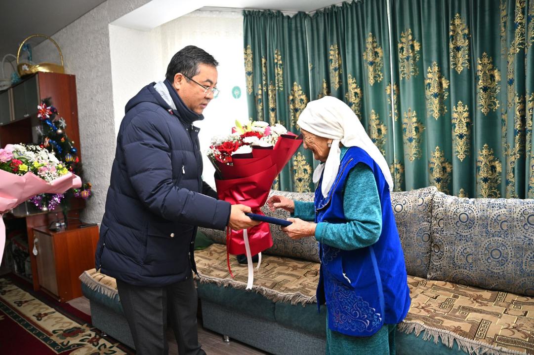 Облыс әкімі әженің қал-жағдайын біліп, ғибратты әңгімесін тыңдады. Қарияның өмір жолы жастарға өнеге екенін тілге тиек етіп, мықты денсаулық тілеп, сыйлығын табыс етті.