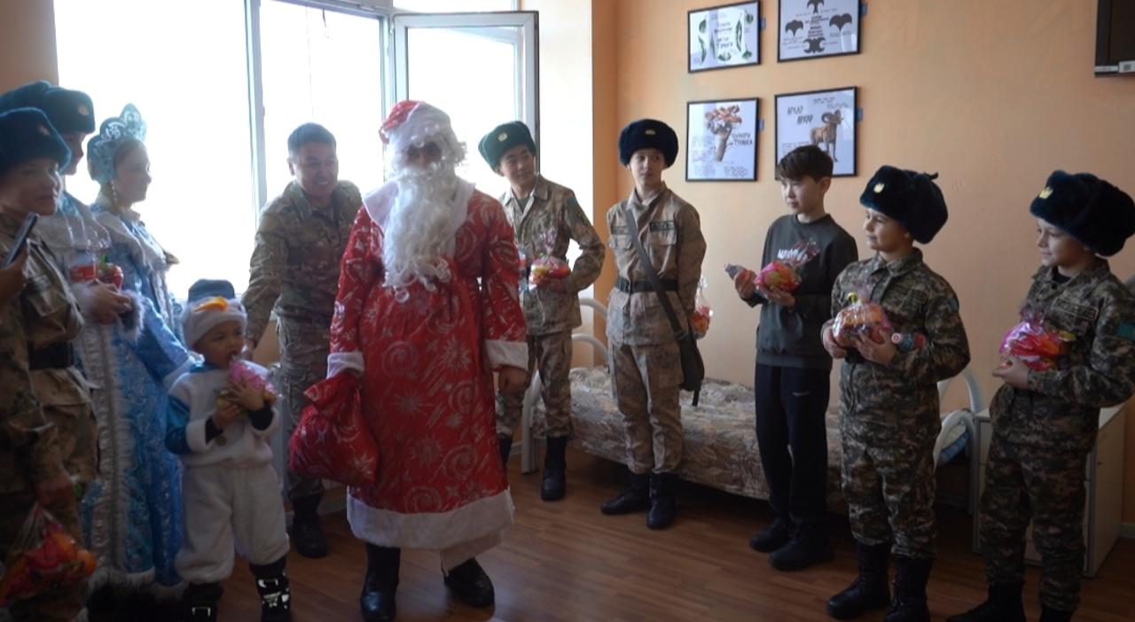 Аяз Атаның терезеден кіруі балалар мен ересектердің көңілінен шықты. Әскери-патриоттық клубтың мүшелері балаларға сыйлықтарын таратты, олар да өз кезегінде өлеңдерін, әндерін айтып берді.