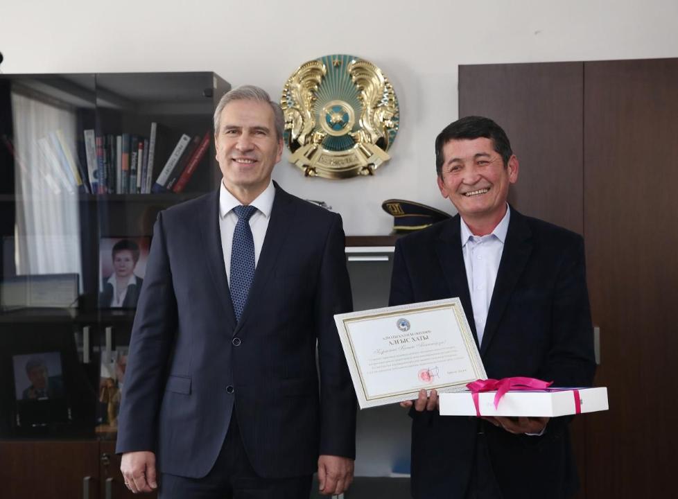 Алматыда мүгедектер арбасындағы жолаушыға назар аударған №66 қалалық маршруттың автобус жүргізушісі Қанат Ахметов мегаполис әкімі Ерболат Досаевтың атынан алғыс алды.