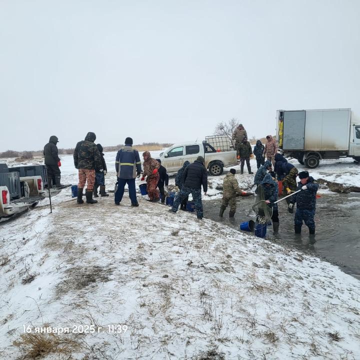 Махамбет ауданына қарасты Х.Ерғалиев елді мекені маңындағы Бақсай су арнасында балық шабақтарын құтқару жұмыстары жалғасуда.