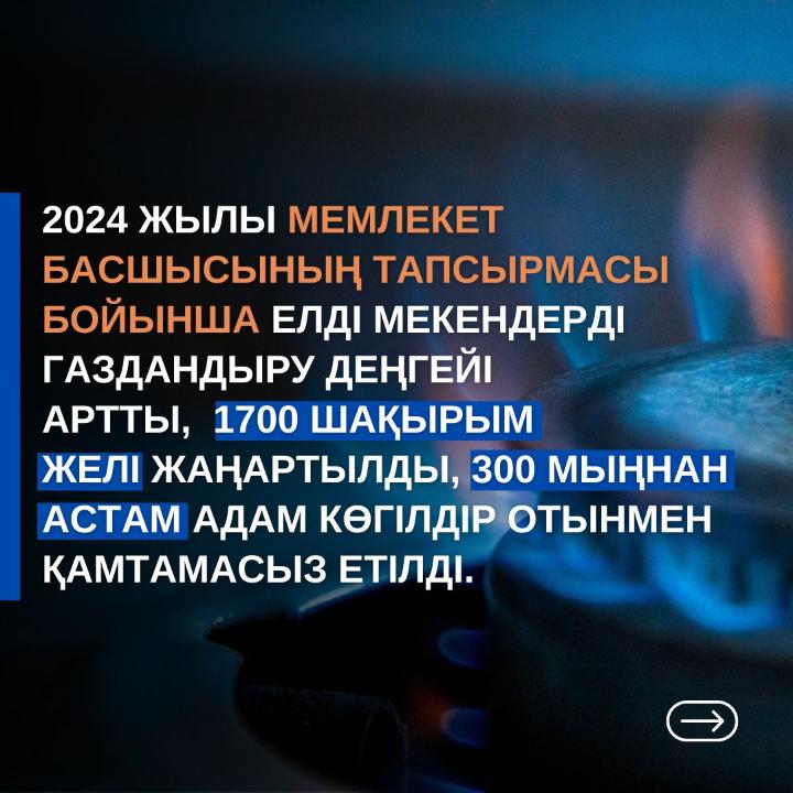 Мемлекет басшысының «Адал адам – Адал еңбек – Адал табыс» Ұлттық құрылтайдың отырысындағы тапсырмасы бойынша 2024 жылы 1 700 шақырымнан астам газ құбыры салынып, 300 мыңнан астам азамат көгілдір отынға қол жеткізді.