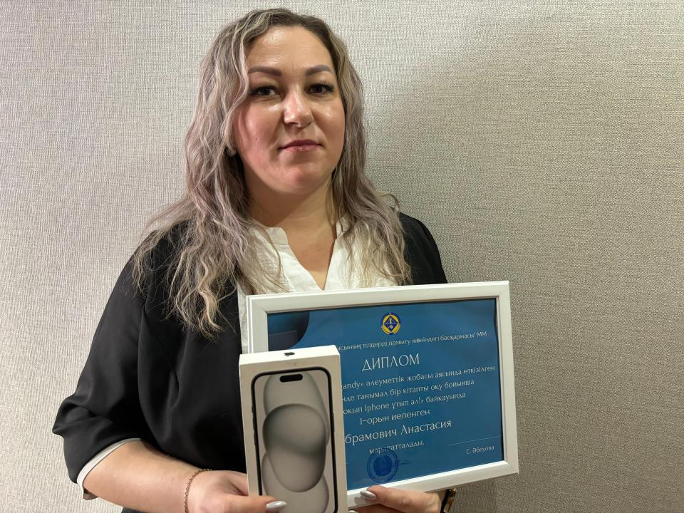Жеңімпазды Қарағанды облысының Тілдерді дамыту басқармасынан құттықтап, диплом мен естелік сыйлық табыс етілді.