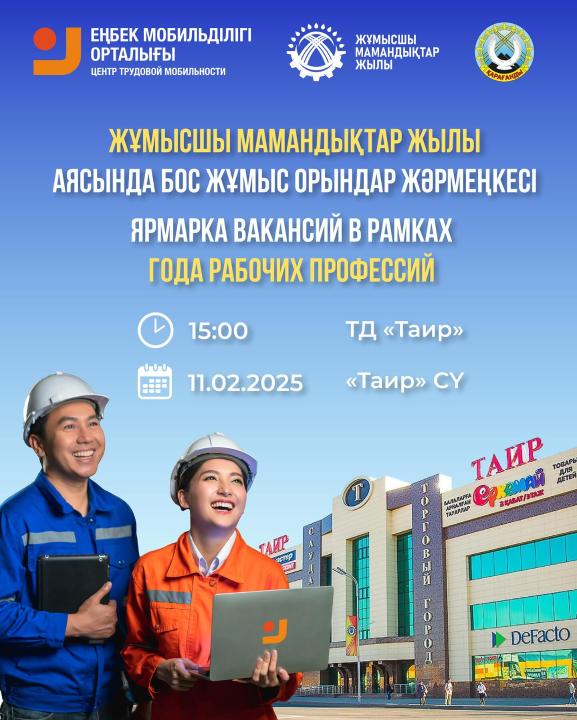 Қарағанды облысы бойынша Еңбек ұтқырлығы орталығы жұмыс іздеп жүргендердің барлығын «Мамандықтар жылы» аясында бос орындар жәрмеңкесіне шақырады. Онда әртүрлі мамандықтар бойынша 700-ге жуық жұмыс орны ұсынылмақ. Жұмыс берушілер ресми жұмысқа, тұрақты жалақыға және әлеуметтік аударымдарға кепілдік береді.