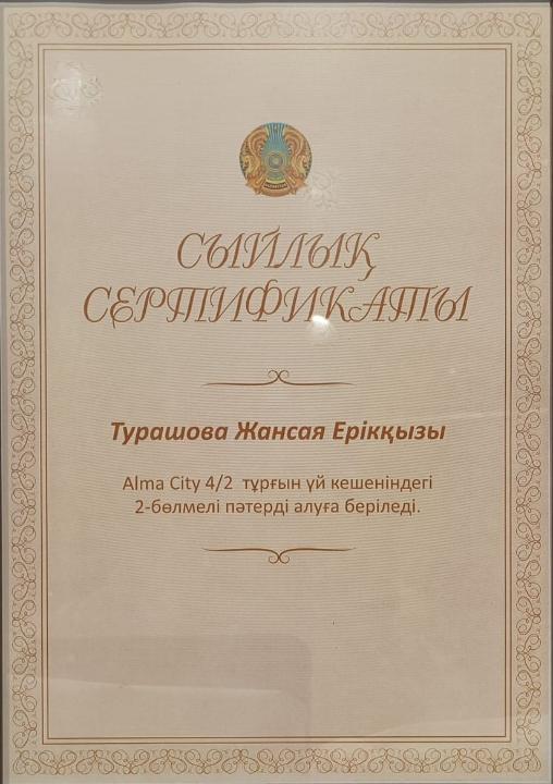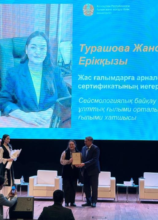Мемлекет басшысының тапсырмасымен ғалымдарға қолдау көрсету, олардың әлеуметтік мәртебесін арттыру және ғылымға жас кадрлардың келуін ынталандыру аясында “Сейсмологиялық бақылаулар мен зерттеулердің ұлттық ғылыми орталығы” ЖШС ғылыми хатшысы Жансая Ерікқызы Тұрашеваға Алматы қаласында 2 бөлмелі пәтер алуға сертификат берілді.