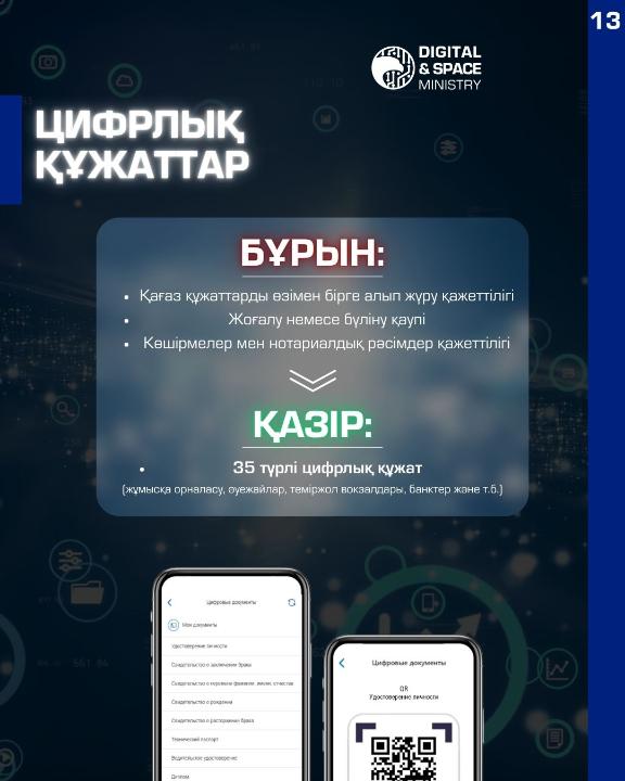 Бүгінгі таңда халықтың 93%-тен астамы eGov порталы арқылы электрондық қызметтерге қол жеткізе алады. Мемлекеттік қызметтердің 90,8%-і смартфондар арқылы қолжетімді. Биометриялық сәйкестендіру мен QR-қолтаңбаларды енгізу электрондық қызметтерді алу процесін жеңілдетті — бір жыл ішінде қазақстандықтар QR-кодтар арқылы 23 миллионнан астам құжатқа қол қойды.