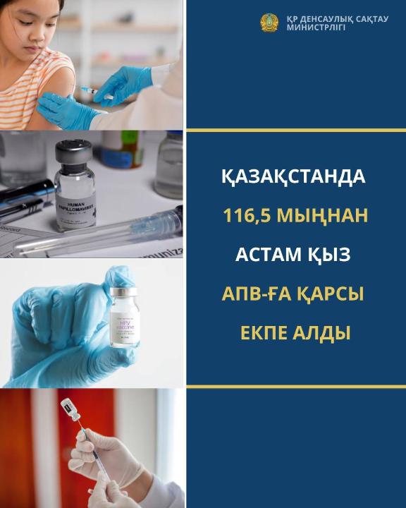 Адам папилломасы вирусына (АПВ) қарсы иммундау науқаны басталғаннан бері Қазақстанда 116,5 мыңнан астам қыз егілді. Вакцинациялаудан кейін егілгендердің арасында жағымсыз жанама әсерлер тіркелмеген.