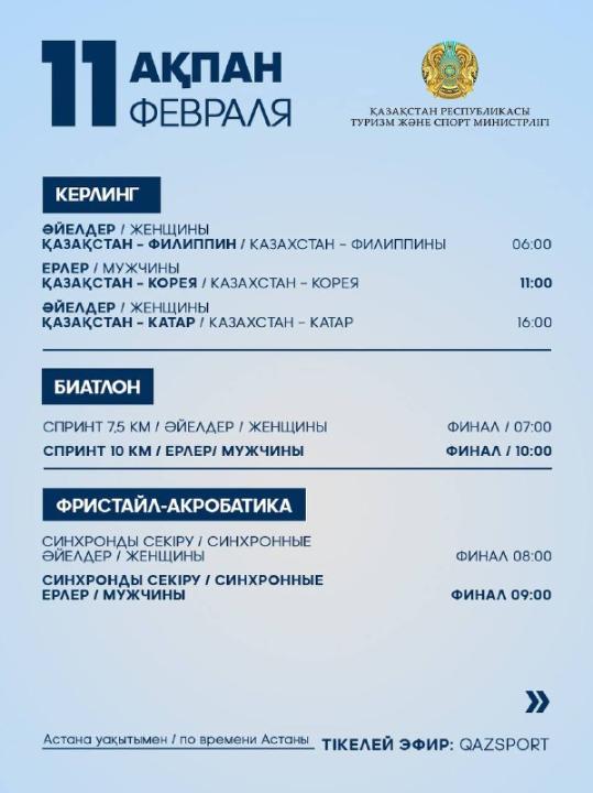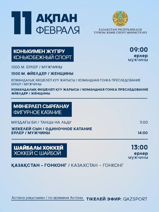 ҚР Ұлттық құрамасының IX қысқы Азия ойындарындағы жарыс кестесі: 11 ақпан