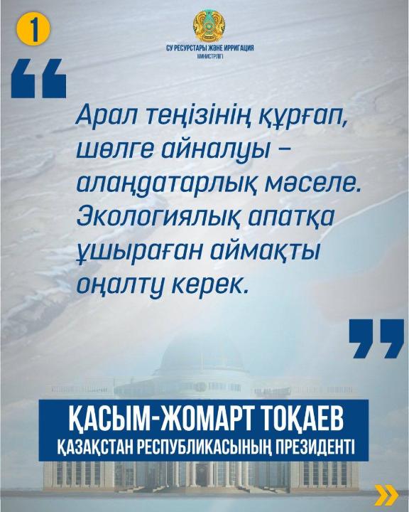 «Арал теңізінің құрғап, шөлге айналуы – алаңдатарлық мәселе. Экологиялық апатқа ұшыраған аймақты оңалту керек. Бұған қоса, трансшекаралық өзендердің су қорын тиімді пайдалану қажет. Ол үшін су үнемдеу технологияларын кеңінен қолдану керек», – деді Қазақстан Республикасының Президенті Қасым-Жомарт Тоқаев.