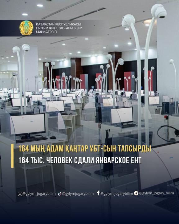 164 мыңға жуық адам қаңтар айындағы ҰБТ-ны тапсырды. Оның ішінде талапкерлердің 76,81%-ы қазақ тілінде, 23,14%-ы орыс тілінде, 89 адам ағылшын тілінде тестілеуден өтті.