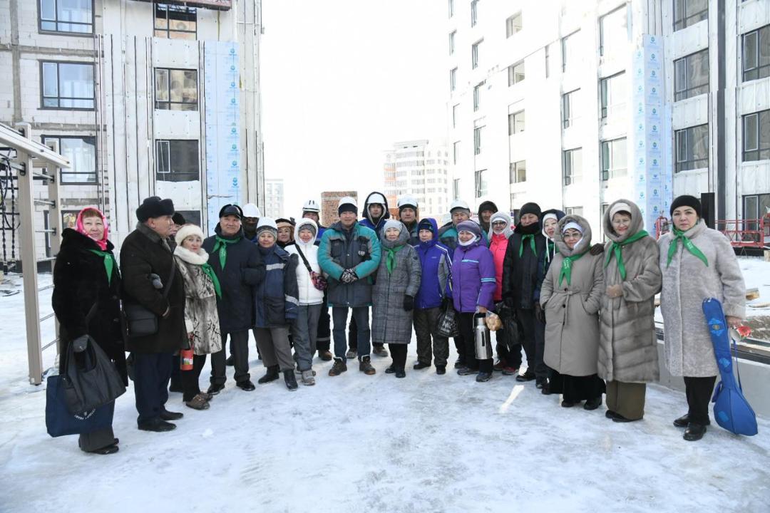 Астаналық зейнеткерлер құрылысшыларға домбырамен ән салып, би билеп, көтеріңкі көңіл күй сыйлады. Сондай-ақ, олар еңбек адамдарына сыйлықтарын табыстап, тәттілерін ұсынды.