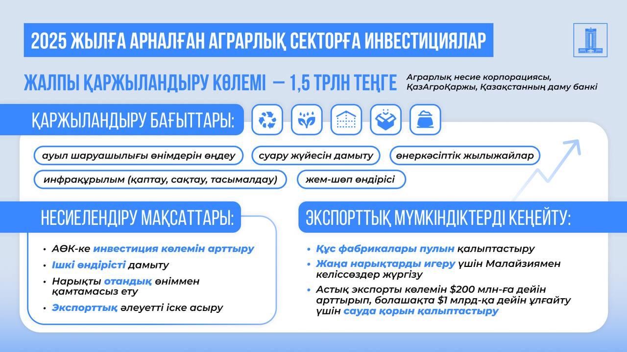 Аграрлық сектор саласындағы инвестициялық жобаларды дамыту үшін 2025 жылы Аграрлық несие корпорациясы (АНК) және ҚазАгроҚаржы арқылы шамамен 1,5 трлн теңге қаражат бағытталады. Қаражат көктемгі егіс және жиын-терім жұмыстарын жүргізуге, инвестициялық жобаларды іске асыруға, негізгі құралдарды сатып алуға және айналым қаражатын толықтыруға, ауыл шаруашылығы техникасының лизингіне беріледі.