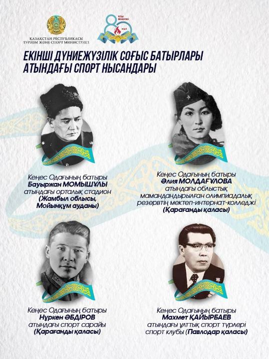 Ұлы Жеңістің 80 жылдығына орай ҚР Туризм және спорт министрлігі Екінші дүниежүзілік соғыс батырлары атындағы спорт нысандары туралы ақпаратты назарларыңызға ұсынады.