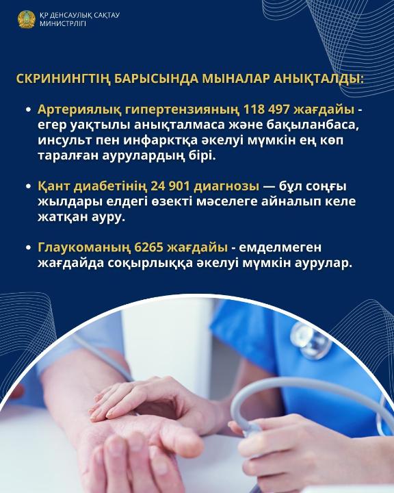Қазақстанда мынадай ең көп таралған 8 ауруды ерте анықтауға скринингтік зерттеулер жүргізілуде: