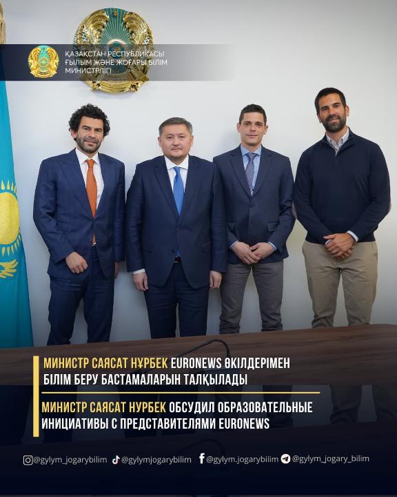 ҚР Ғылым және жоғары білім министрлігінде министр Саясат Нұрбектің Euronews өкілдерімен кездесуі өтті. Іс-шараға Alpac Capital тең құрылтайшысы және басқарушы серіктес Луис Сантос, Alpac Capital директоры, Euronews Astana Ltd Бас директоры Питер Ваджай, DreamShaper тең құрылтайшысы және бас директоры Жоао Борхес, Euronews Astana Ltd өкілі Альмира Мақаш қатысты.