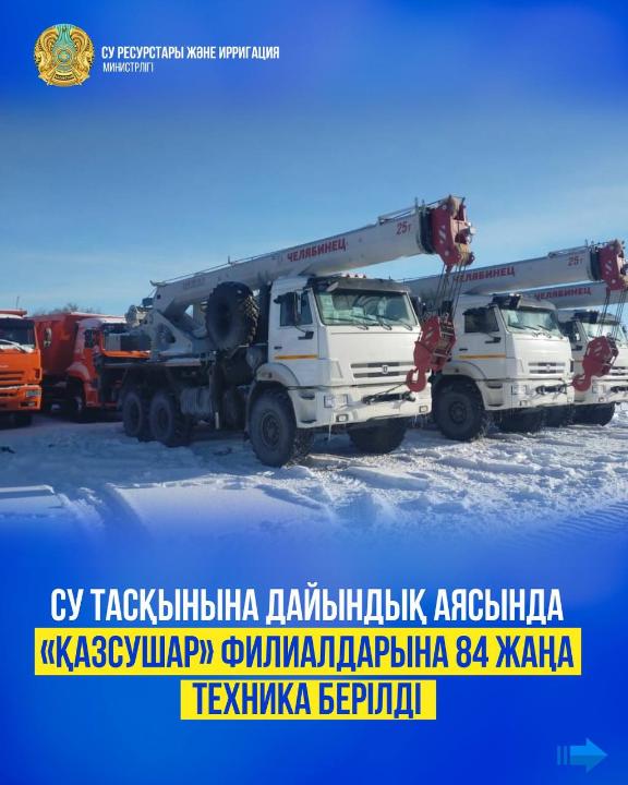 Су ресурстары және ирригация министрлігі су тасқынына дайындық аясында «Қазсушар» филиалдарын 84 жаңа техникамен қамтамасыз етті. Оның ішінде 8 автокран, 14 самосвал, 7 трактор, 23 тиегіш және 32 газель көлігі бар.