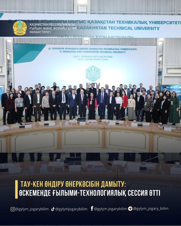 Д.Серікбаев атындағы Шығыс Қазақстан техникалық университетінде «Қазақстан Республикасының тау-кен өндіруші кәсіпорындарының ғылыми-технологиялық дамуы» тақырыбында екі күндік ғылыми-технологиялық сессия өтті. Бұл шара ҚР Ғылым және жоғары білім министрлігі мен «Казцинк» ЖШС қолдауымен ұйымдастырылды.