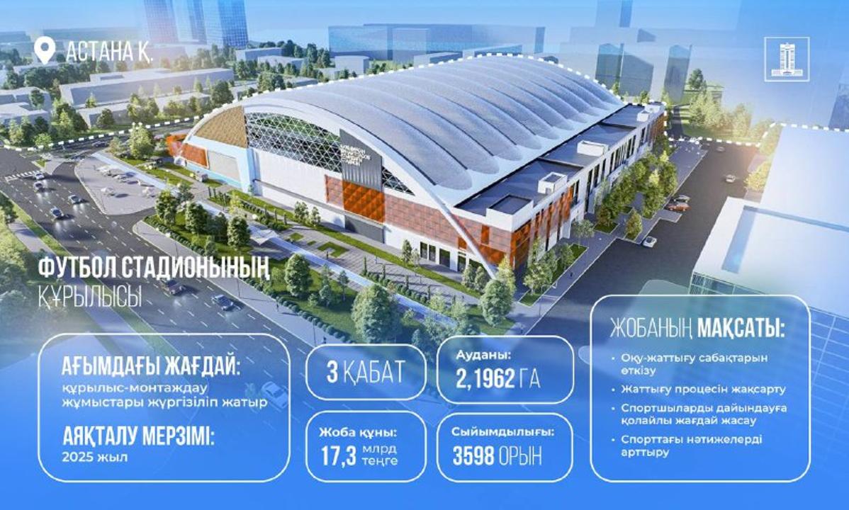 Спорт нысаны қозғалыс мүмкіндігі шектеулі азаматтарға арналған орындарды қоса алғанда, 3598 орынға есептелген. Стадион UEFA халықаралық стандарттарына сай салынады. Құрылыс аяқталғаннан кейін нысанды Астана қаласы әкімдігінің №8 олимпиадалық резервтегі мамандандырылған балалар-жасөспірімдер спорт мектебінің балансына беру жоспарланып отыр.