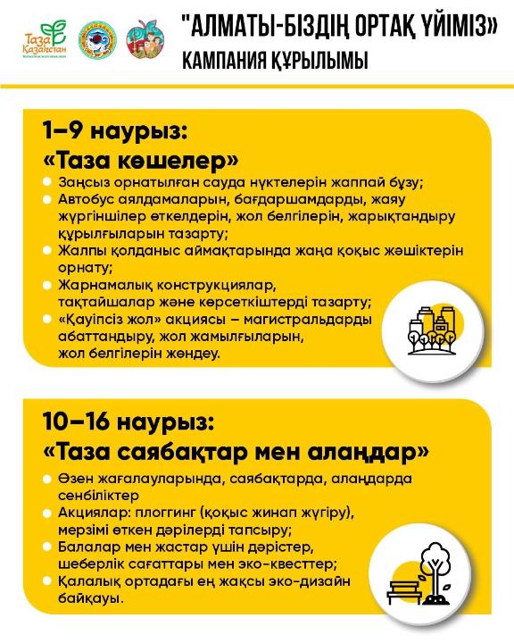 Алматыда 1 наурыз бен 1 сәуір аралығында «Таза Қазақстан» республикалық бағдарламасы аясында «Алматы – біздің ортақ үйіміз» атты ауқымды қалалық науқан өтеді. Бұл науқан қала инфрақұрылымын жаңарту мен жақсартуға, экологиялық мәдениетті арттыруға және тұрғындарды қаланы дамытуға тартуға бағытталған.