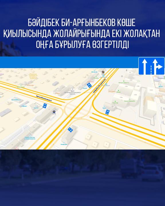 – Атап айтқанда, бүгінде Бәйдібек би және Арғынбеков көшелерінің қиылысындағы жолайрықтағы бағыттар өзгерді. Бәйдібек би және Арғынбеков көшелері арқылы айналмалы жолға қосылатын автокөліктер 2 жолақтан да өтуге мүмкіншілік қарастырылып, жол таңбалары сызылды.