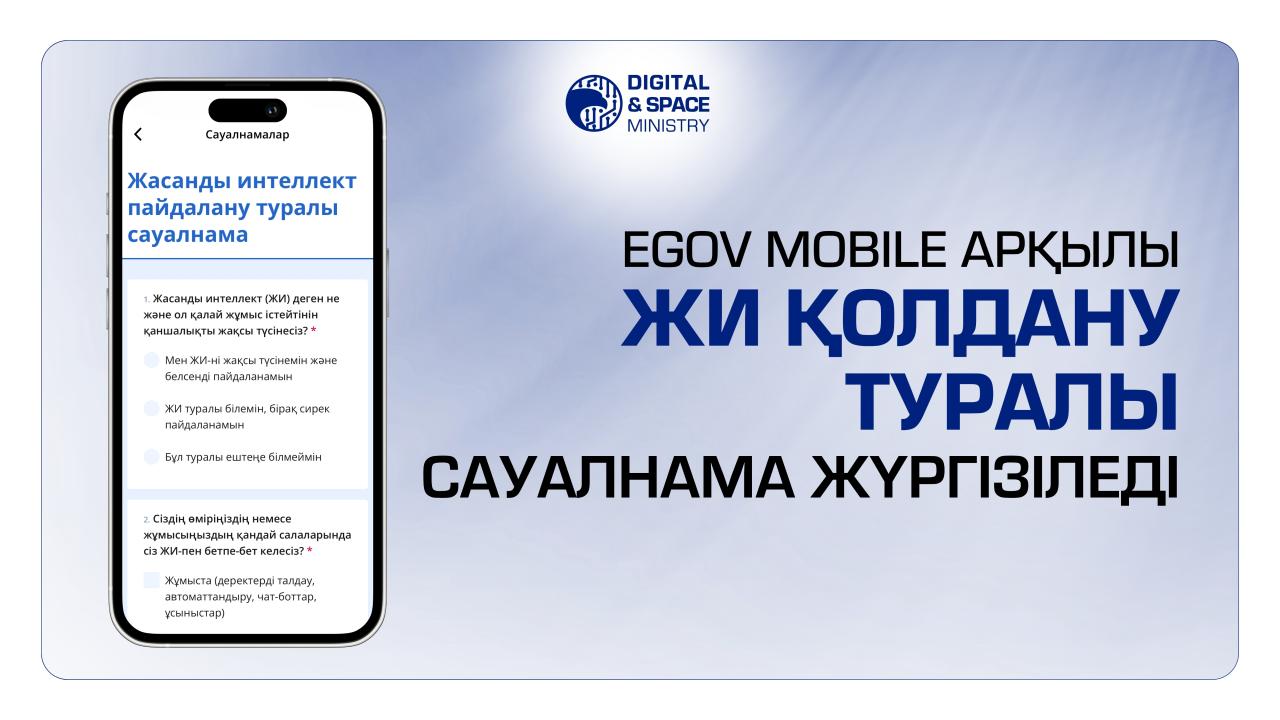 3-9 наурыз аралығында Цифрлық даму министрлігі азаматтар арасында жасанды интеллект (ЖИ) технологияларын қолдану туралы сауалнама жүргізеді. Сауалнамаға eGov mobile мобильді қосымшасы арқылы «Хабарламалар» бөлімінде қатысуға болады.
