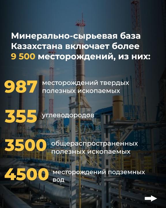 Қазақстанның минералдық-шикізаттық базасы 9500-ден астам кен орындарын қамтиды, оның 987-і қатты пайдалы қазбалардың кен орындары; көмірсутектер – 355, кең таралған пайдалы қазбалар – 3500-ден астам және жер асты суларының 4500-ден астам кен орындары.