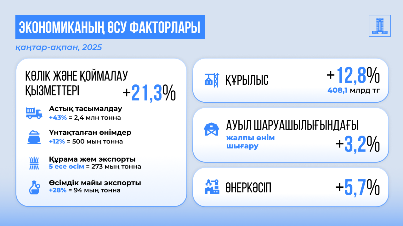 Құрылыс саласында жоғары қарқын сақталған. Орындалған жұмыстар көлемі 408,1 млрд теңгеге, ал нақты көлем индексі 112,8%-ға жетті. Сауда саласындағы өсім 6%-ға, ал көлік және қоймалау қызметі 21,3%-ға артқан. Жалпы, астық, тұқым және мал азығы (өсім 5,8 есе), фармацевтикалық өнімдер (44,6%-ға), автокөліктер мен жеңіл көліктер (38,8%-ға) өткізетін көтерме сауда кәсіпорындары айтарлықтай жоғары үлес қосты. Астық тасымалы 43%-ға артып, 2,4 млн тоннаға жетті, ал ұн өнімдерін тасымалдау 12%-ға өсті.