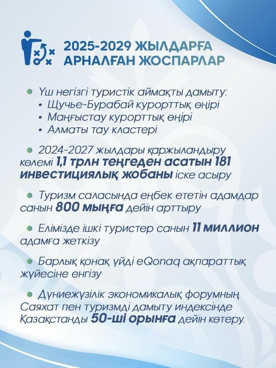 Ішкі туристер санын 11 миллион адамға жеткізіп, елдегі орналастыру орындарының төсек-орын қорын 280 мыңға дейін ұлғайту, сондай-ақ барлық қонақ үйді eQonaq ақпараттық жүйесіне енгізу көзделген.