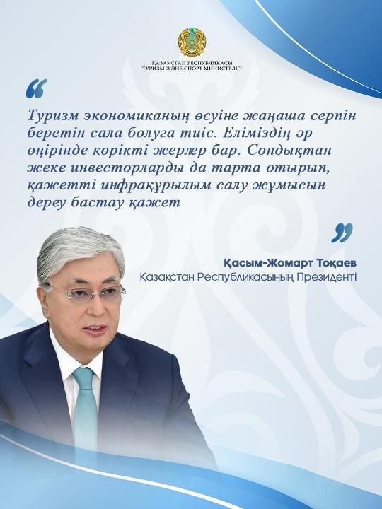 «Туризм экономиканың өсуіне жаңаша серпін беретін сала болуға тиіс. Еліміздің әр өңірінде көрікті жерлер бар. Сондықтан жеке инвесторларды да тарта отырып, қажетті инфрақұрылым салу жұмысын дереу бастау қажет».