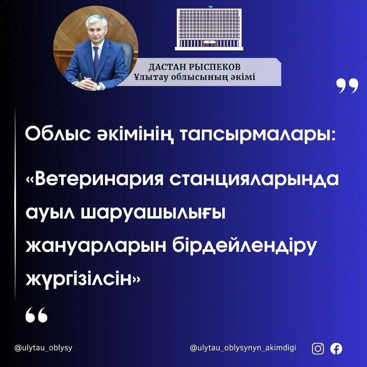 Жиын барысында Ұлытау облысының әкімі Дастан Рыспеков өңірдегі ветеринариялық станцияларда ауыл шаруашылығы жануарларын бірдейлендіруді, мал шаруашылығындағы сақтандыру бағдарламалары аясында шаруа қожалықтарына түсіндірме жұмыстарын жүргізуді, қараусыз жайылып жүрген малдар бойынша шаруа қожалықтарымен және елді-мекендердегі тұрғындармен тиісті жұмыстар жүргізуді тапсырды.