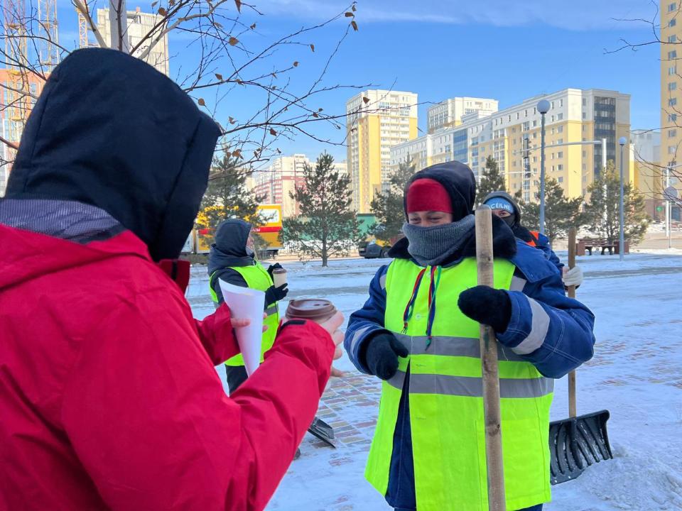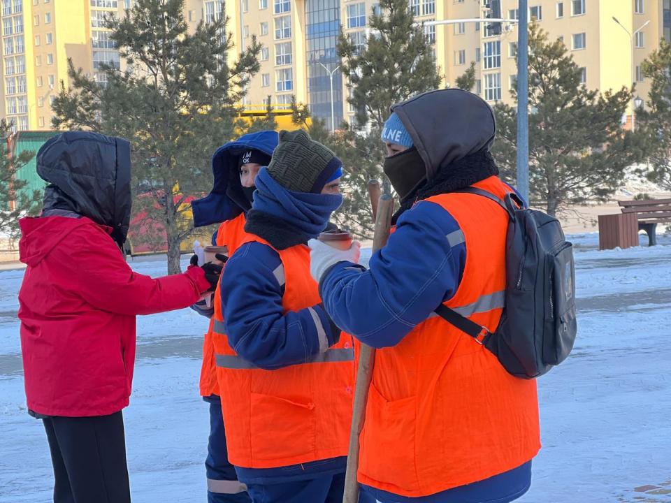 Іс-шара барысында коммуналдық қызметшілерге еңбектеріне алғыс ретінде ыстық шай мен бауырсақ берілді. Олар ауа райына қарамастан күн сайын қала тазалығына үлкен үлес қосады.