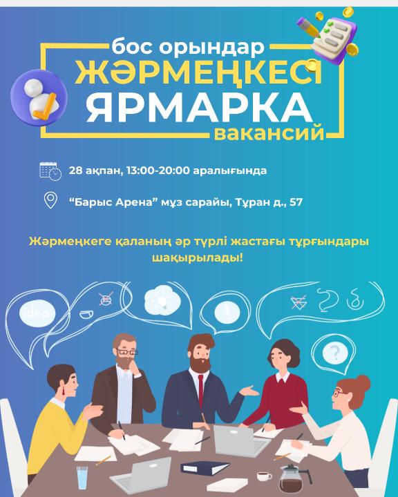 28 ақпанда елордада жұмысшы мамандықтар жылына орайластырылған бос орындар жәрмеңкесі өтеді. Нұра ауданы әкімдігінің ұйымдастыруымен өтетін іс-шарада 50-ден астам жұмыс беруші білім беру мен медицинадан бастап бизнес пен мемлекеттік қызметке дейінгі түрлі салада 200-ден астам бос жұмыс орнын ұсынады.