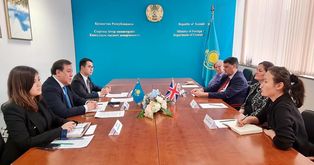 Кездесу барысында ҚР СІМ Консулдық қызмет департаментінің директоры Азамат Аубеков және Ұлыбритания СІМ Еуропа және Орталық Азия елдері бойынша жаңадан тағайындалған Өңірлік консулдық директоры Луиза Эллис екі мемлекет азаматтарының құқықтары мен мүдделерін қорғау, визалық және көші-қон рәсімдерін жетілдіруді қоса алғанда, кең ауқымды мәселелерді талқылады.