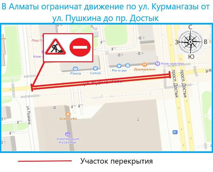 2025 жылы 15 наурызда сағат 09:00-ден 15:00-ге дейін Алматының Алмалы ауданында Құрманғазы көшесінде, Достық даңғылынан Пушкин көшесіне дейінгі аралықта автокөлік қозғалысы қиындайды.