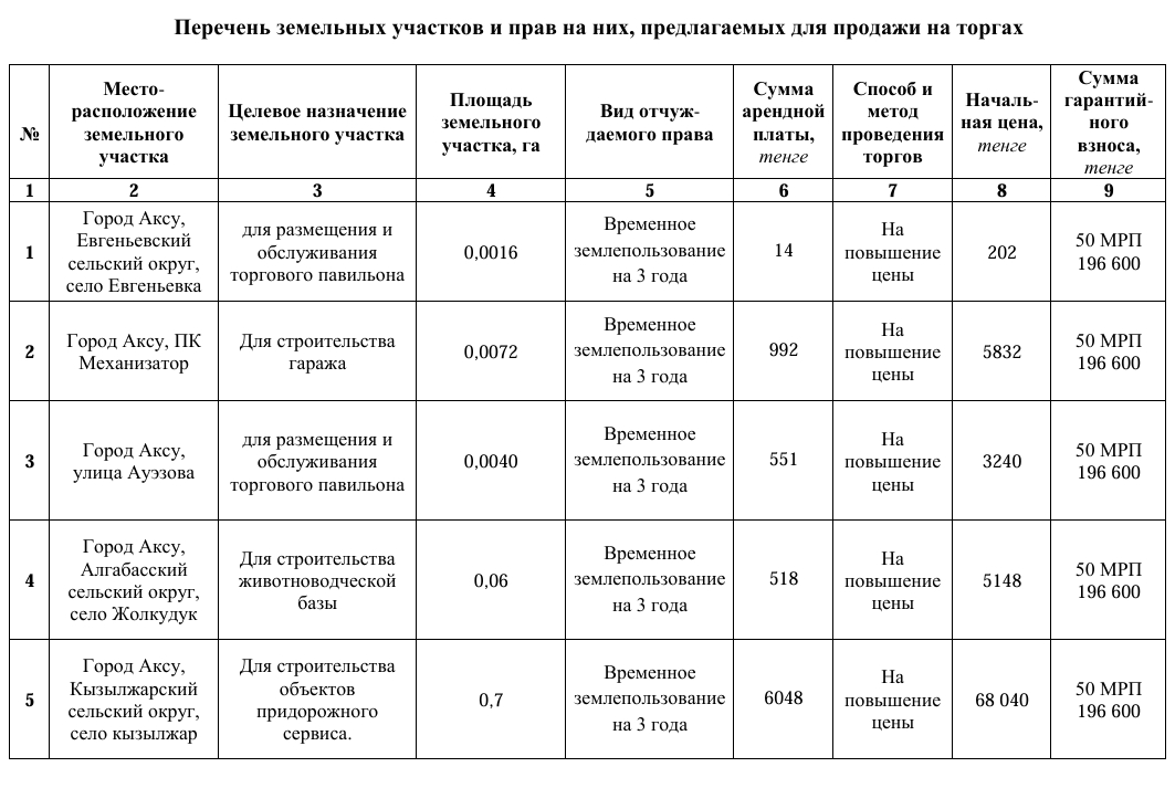 Аукционда 3 жылға дейінгі мерзімге жалға алуға құқығы бар жер учаскелері ұсынылады.