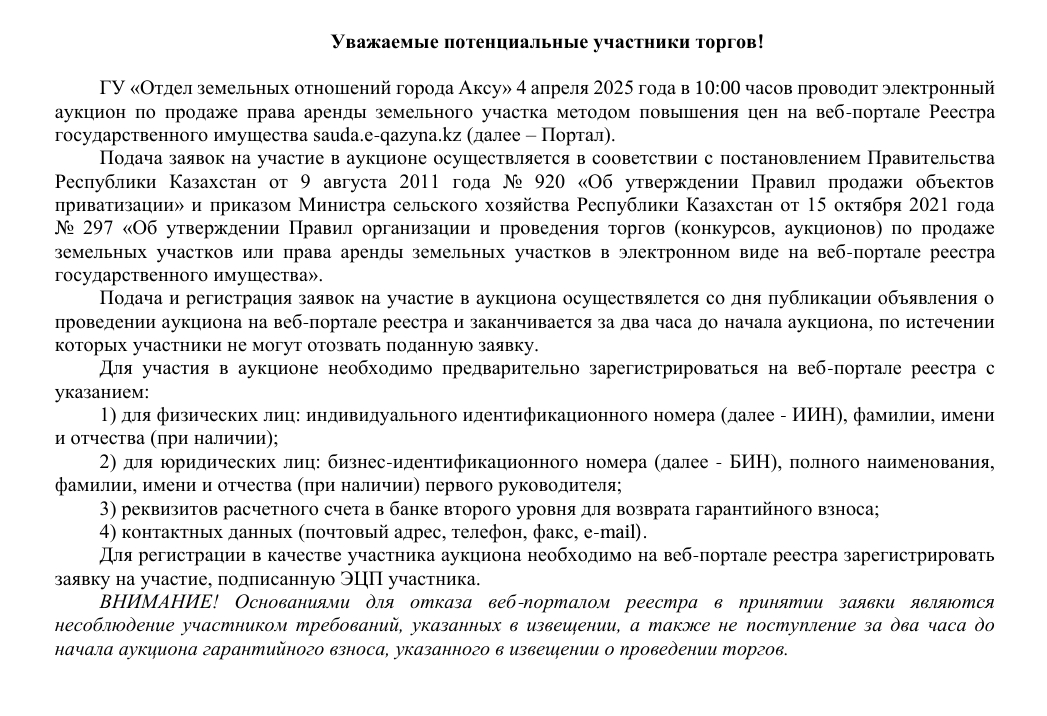 «Ақсу қаласының жер қатынастары бөлімі» ММ 2025 жылғы 4 сәуірде сағат 10:00-де электрондық аукцион өткізеді