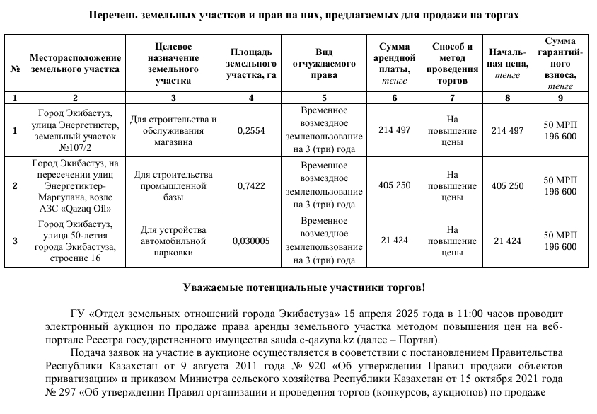 Аукционда 3 жылға жалға беру құқығымен жер учаскелері ұсынылған.