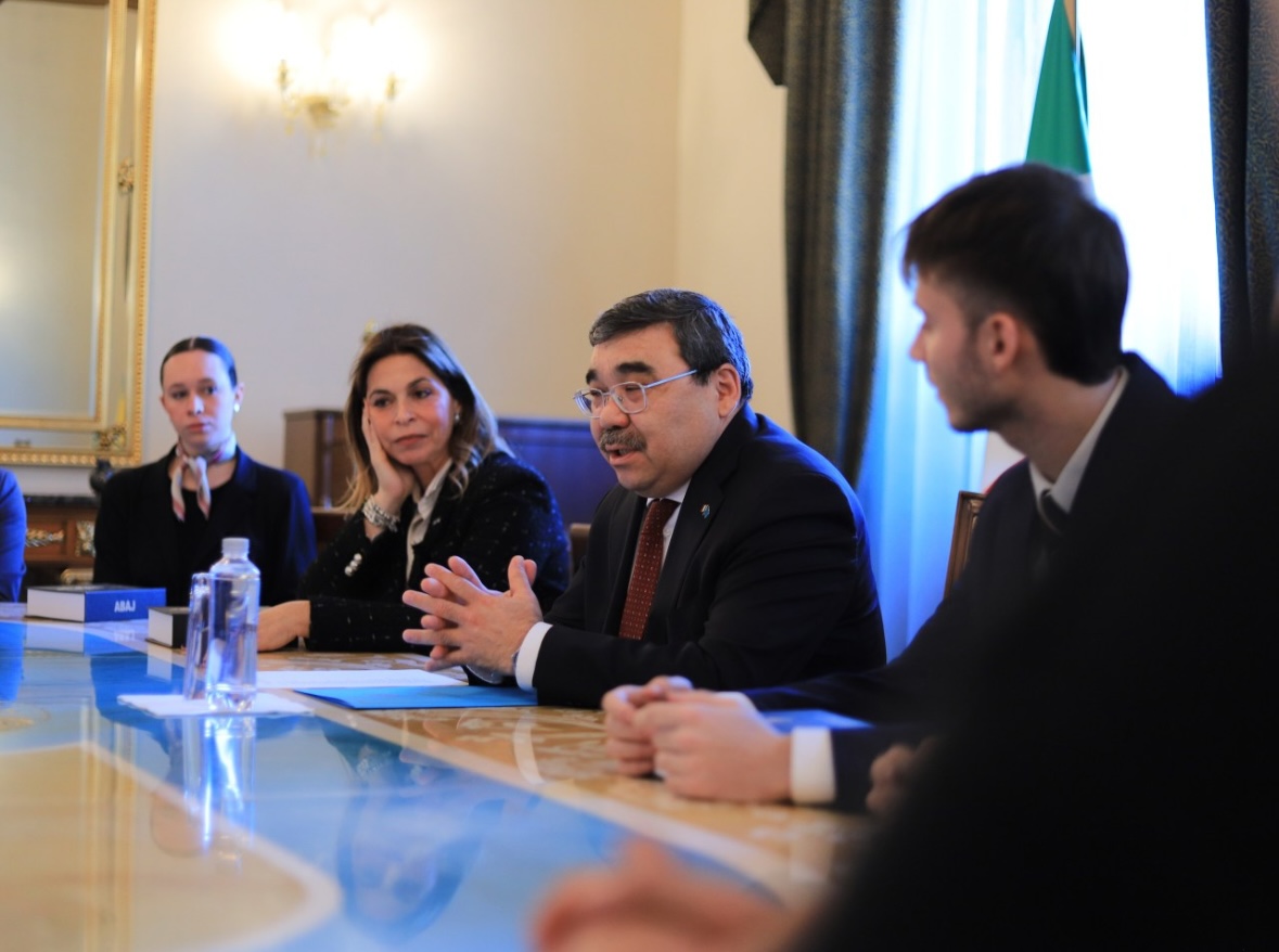 Рим, 19 наурыз 2025 жыл – Қазақстанның Италиядағы Елшілігінде Елші Ерболат Сембаевтың биыл сәуір айында Нью-Йорк қаласында Қазақстан Республикасының атынан өкілдік ететін делегаттар ретінде БҰҰ моделіне, яғни БҰҰ комиссияларының жұмысын имитациялау жөніндегі ойындарға қатысуды жоспарлап отырған итальяндық жоғары оқу орындарының студенттерімен – “Ambasciatori – Next Generation Italia” қауымдастығының мүшелерімен кездесуі өтті. Кездесуде Елші Е.Сембаев итальяндық студенттерге Қазақстанның сыртқы саясатының негізгі басымдықтары туралы баяндап, еліміздің кейбір халықаралық мәселелер бойынша ұстанымымен таныстырды.