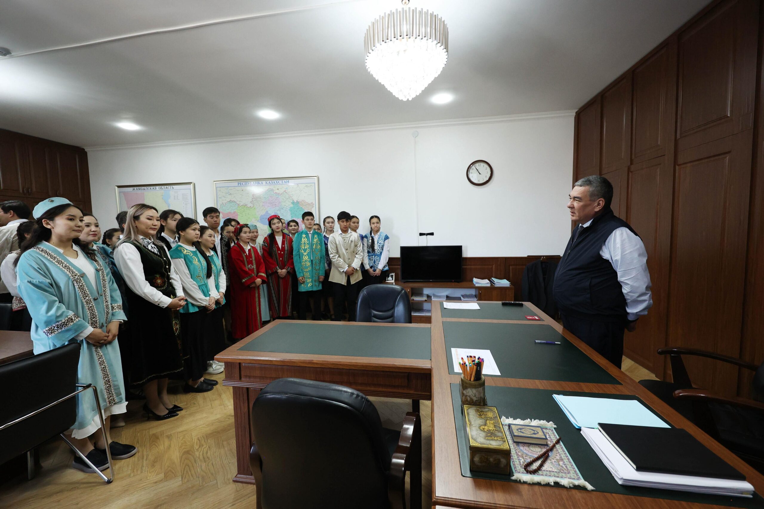Ұлттық нақышта киініп, жүздері бал-бұл жайнаған жеткіншектерді облыс әкімі аппараты басшысының орынбасары Жанболат Нұрмолдаұлы жылы шырайда қарсы алып, ол өңірдің бас ғимараты туралы қызықты деректерімен бөлісіп,оқушыларға экскурсия жүргізді.