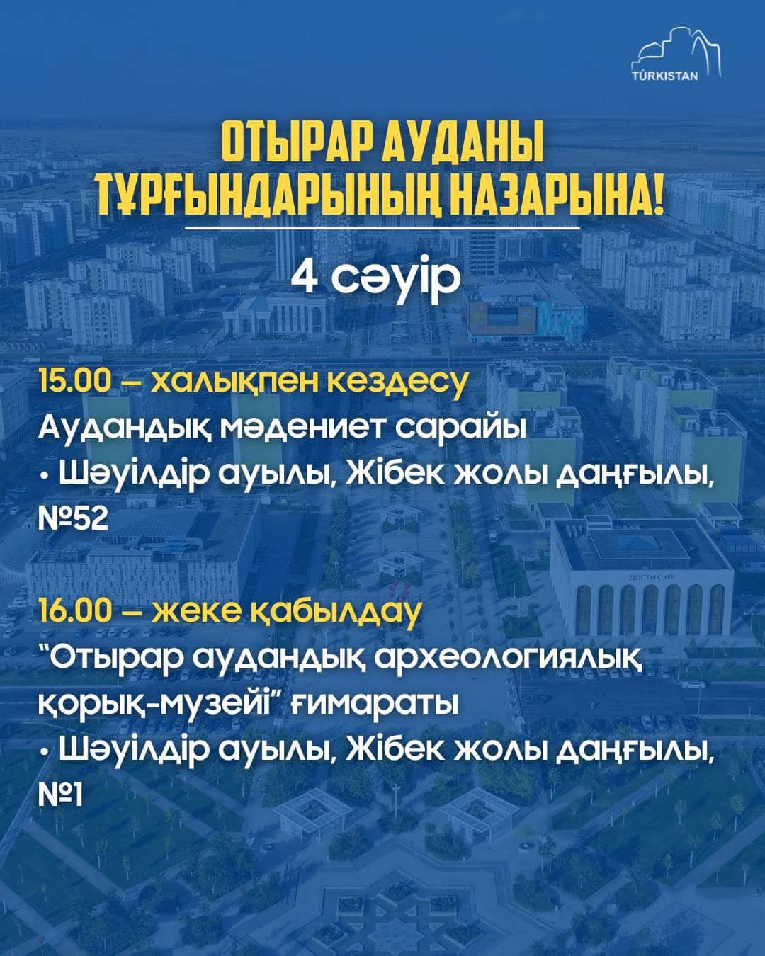 Қазақстан Республикасы Президентінің 2022 жылғы 3 наурыздағы «Әкімдердің халықпен кездесулерін өткізу туралы» №826 Жарлығын іске асыру аясында Түркістан облысының әкімі Нұралхан Оралбайұлы Көшеровтің Отырар ауданының тұрғындарымен кездесуі 2025 жылғы 04 сәуірде сағат 15.00-де аудандық мәдениет сарайында (Шәуілдір ауылы, Жібек жолы даңғылы №52), жеке қабылдауы сағат 16.00-де аудандық «Отырар аудандық археологиялық қорық-музейі” ғимаратында (Шәуілдір ауылы, Жібек жолы даңғылы №1) өтетінін хабарлаймыз!