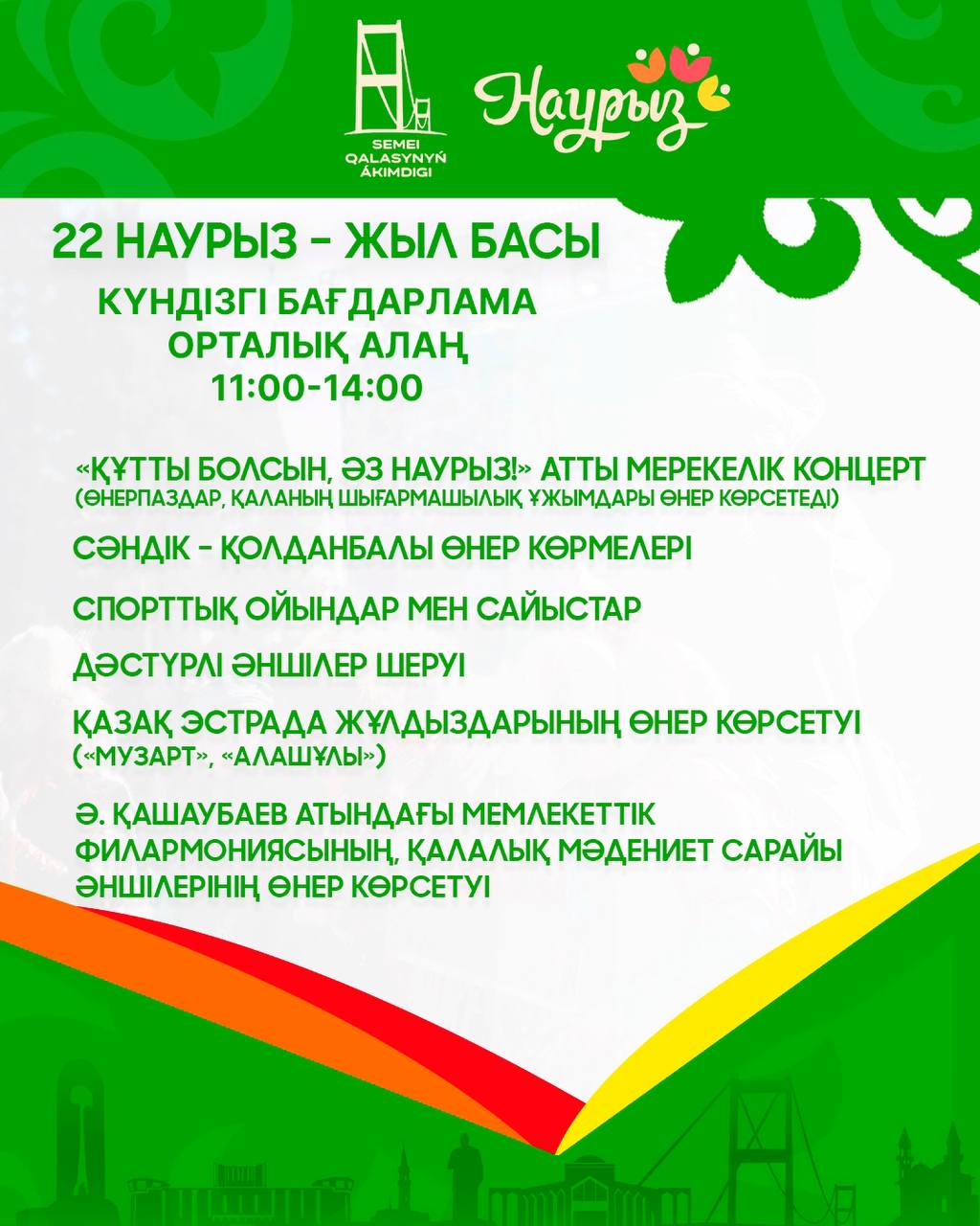 Бас сахнада «Наурыз-керуен» қойылымы, дәстүрлі әндер, би қойылымдары, жергілікті өнерпаздар мен эстрада жұлдыздарының концерті.