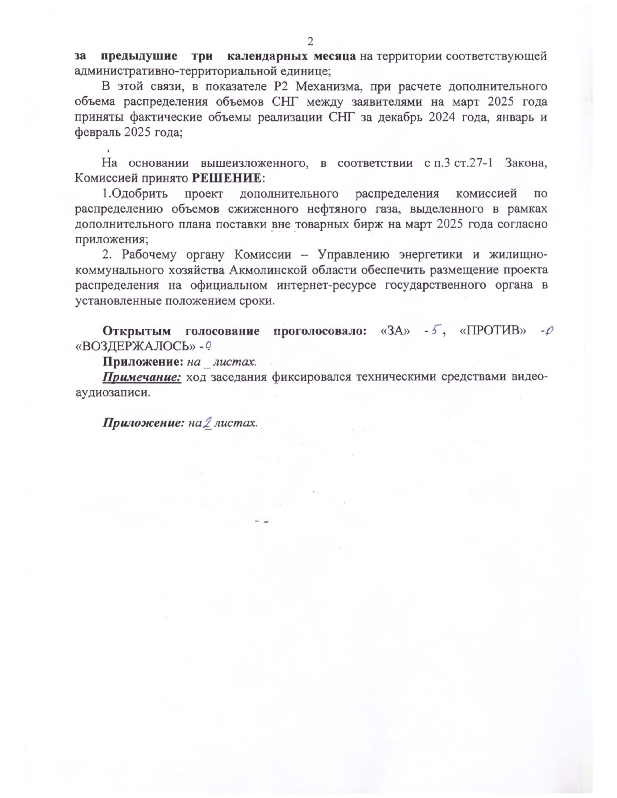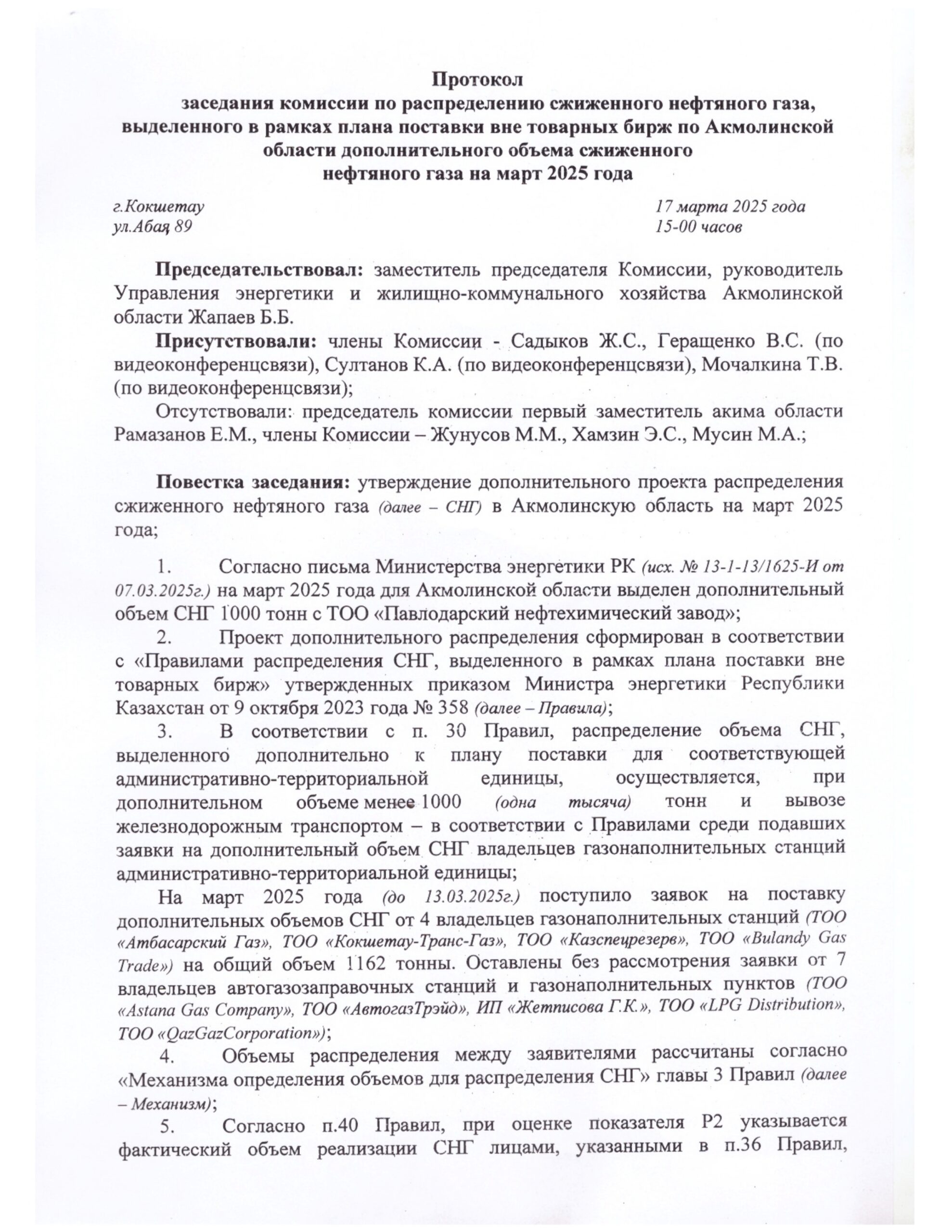 2025 жылғы 17 наурызда тауардан тыс жеткізу жоспары шеңберінде бөлінген сұйытылған мұнай газын бөлу жүргізілді Ақмола облысы бойынша биржалар 2025 жылғы наурызға арналған сұйытылған мұнай газының қосымша көлемі. Бекітілген тарату жобасы өндіруші зауыттарға және Қазақстан Республикасының Энергетика министрлігіне жіберілді. Отырыс хаттамасының көшірмелері, бөлу жобалары, көлемдерді анықтау тетіктері қоса беріледі.