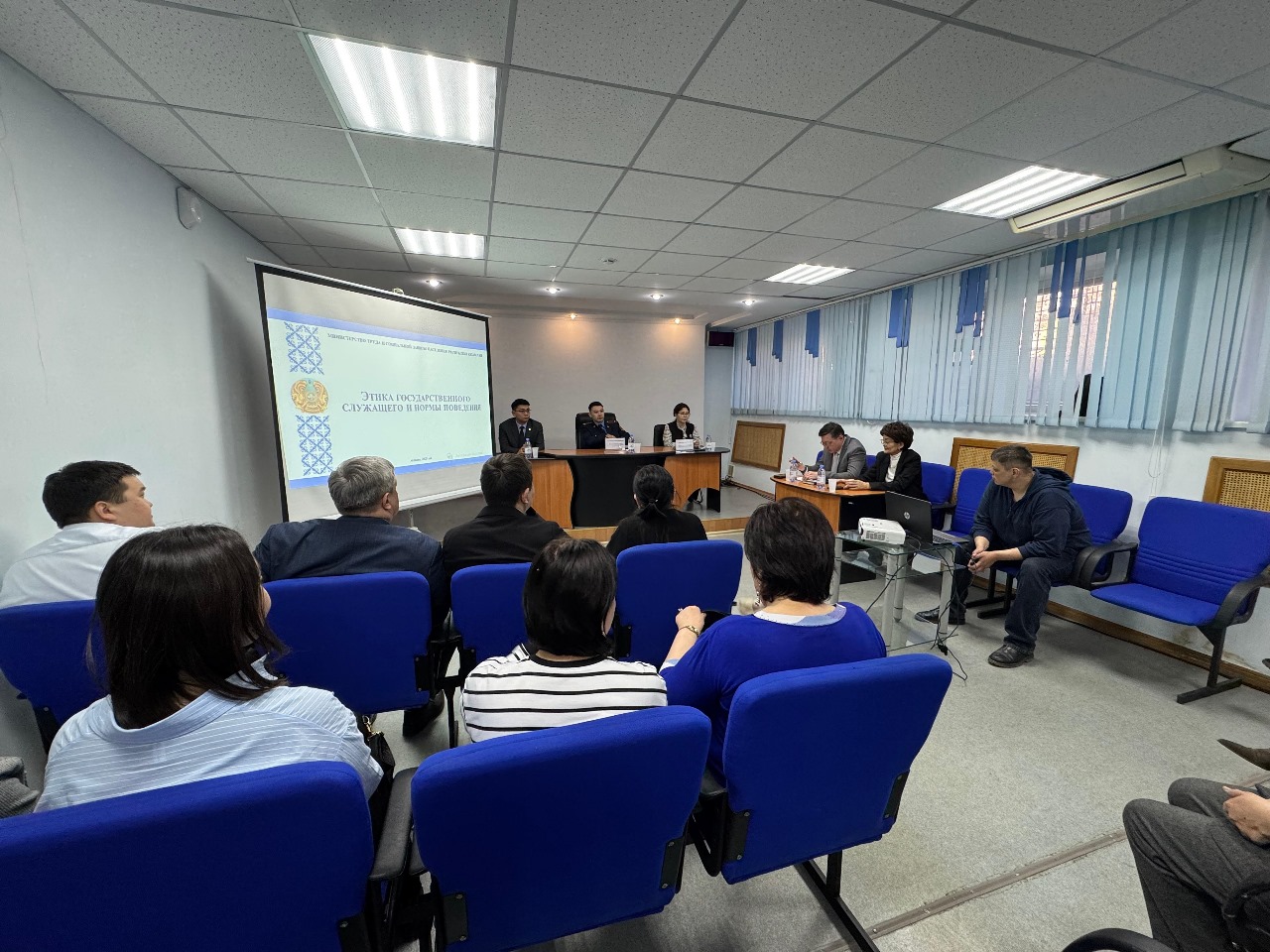 Республикасы Сыбайлас жемқорлыққа қарсы іс-қимыл агенттігінің Павлодар облысы бойынша департаментінің аса маңызды істер жөніндегі офицері Б. Д. Қожабергеновпен және ҚР Мемлекеттік қызмет істері агенттігінің Павлодар облысы бойынша департаментінің Мемлекеттік қызмет саласындағы бақылау басқармасының басшысы Е. Д. Абисаликовпен бірлесіп, Қазақстан Республикасыекі департамент қызметкерлерімен түсіндіру кездесуі: