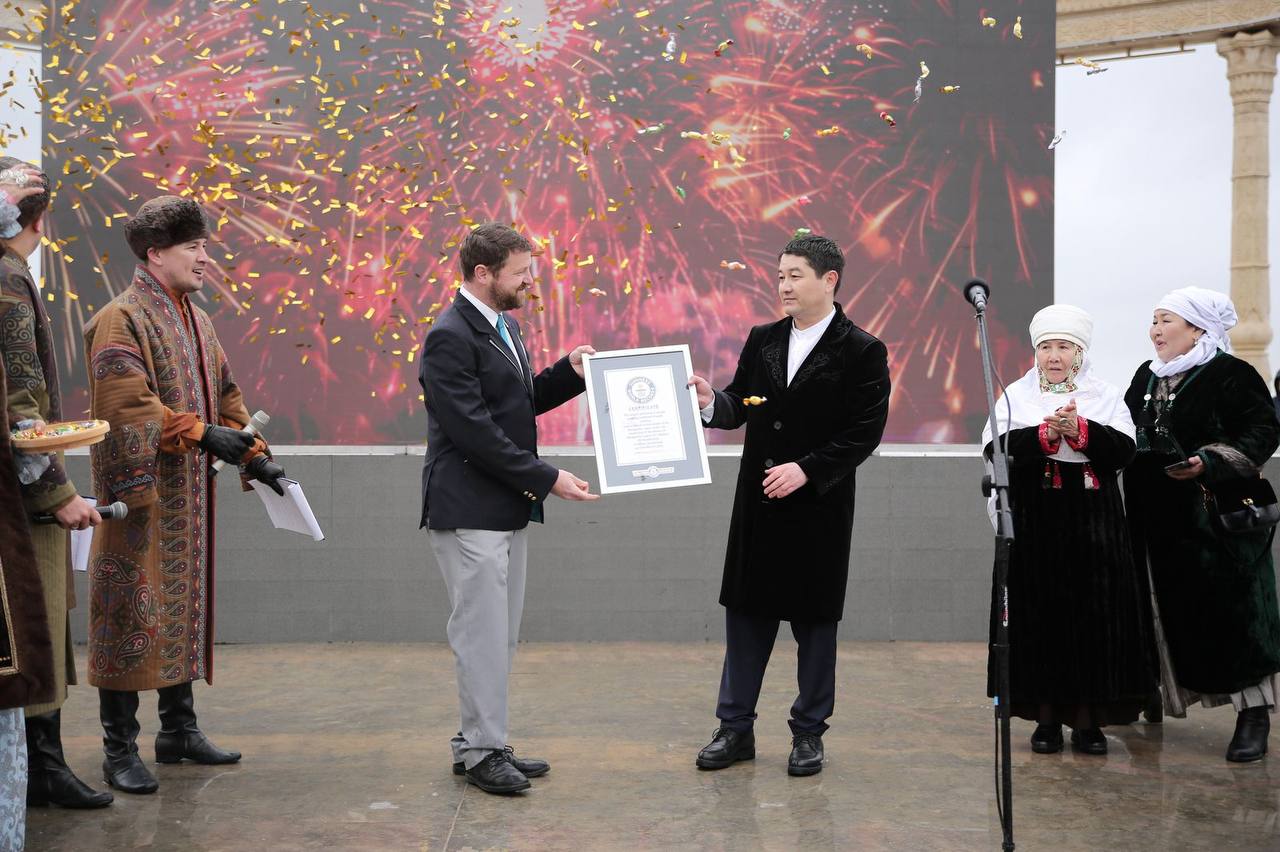 – Ұлыстың ұлы күнінде тарихи сәттің куәсі болып отырмыз. Қазақ халқының терең тарихы мен бай мәдени мұрасын, ұлттық дәстүрімізді жер жаһанға паш еттік. Маңғаз Маңғыстауымызда қазақтың ұлттық киімінен әлемдік рекорд орнады. Осынау зор жетістікпенен барша отандастарымызды құттықтаймын! Қазақ халқының мәдениетін насихаттауға атсалысқан бастамашы топқа, Лондон қаласынан арнайы келген Гиннесс рекордтар кітабының өкілдеріне және рекорд орнатуға үлес қосқан барша қатысушыларға алғысымды білдіремін!