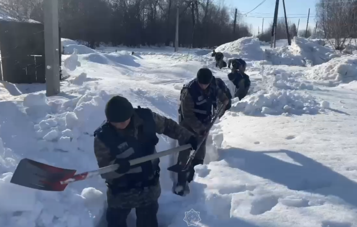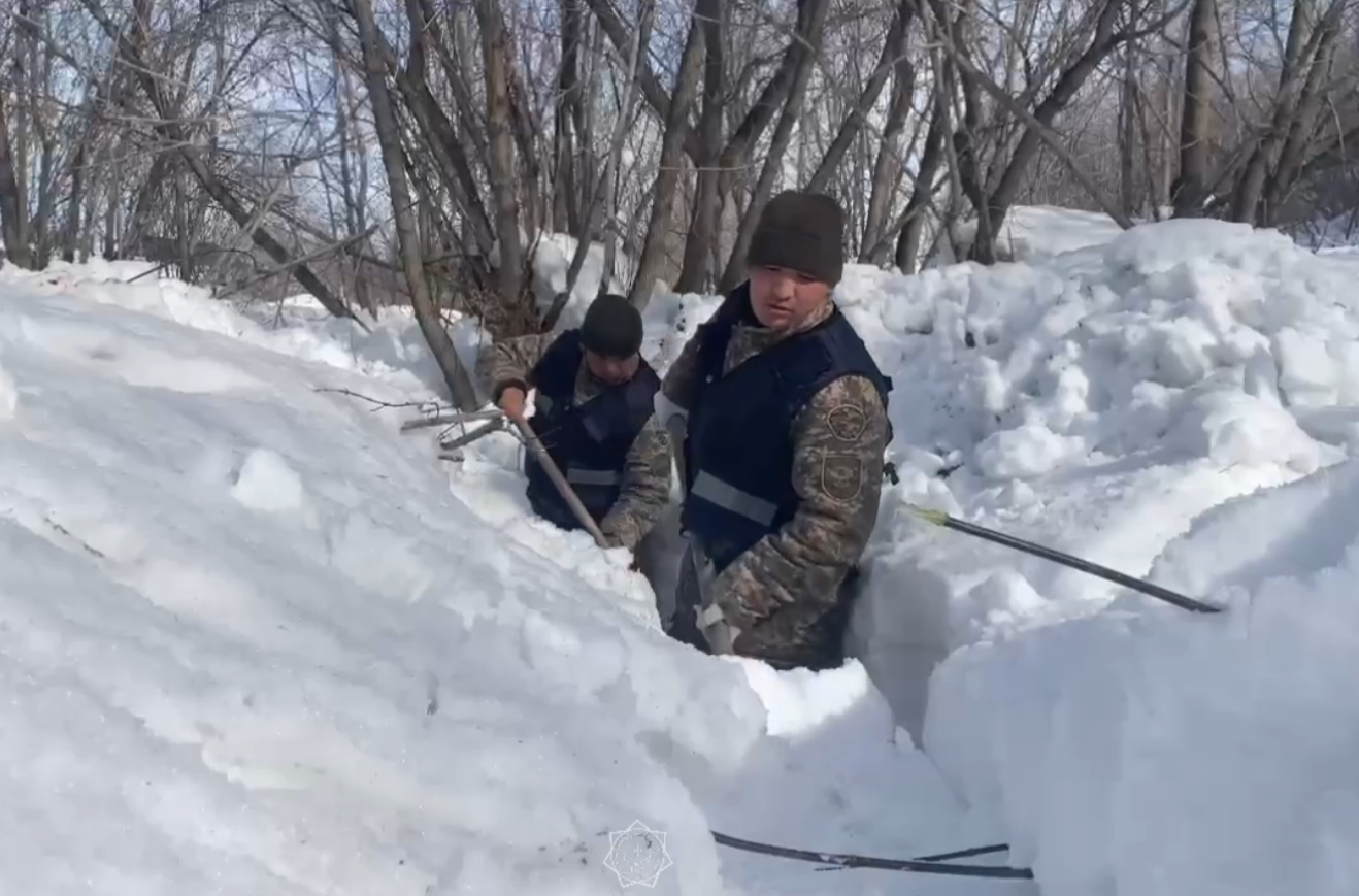ҚР ТЖМ 68303 әскери бөлімінің әскери қызметшілері қиын қолжетімді учаскелерді қардан тазартып, еріген судың кедергісіз ағуы үшін су өткізу құрылыстары мен арықтарды ашуда.