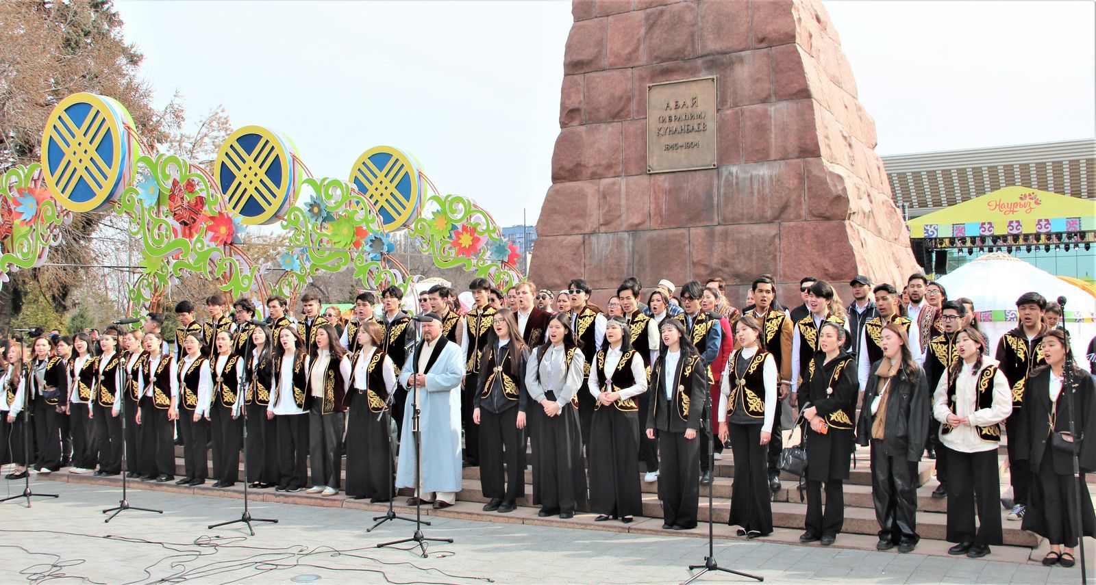 Көп ұзамай, Алматы аспанында ұлы поэзияның әуенге айналған үні әуеледі. Сағат 10:00-де мыңдаған дауыс бір мезетте «Көзімнің қарасы» және «Желсіз түнде жарық ай» әндерін әуелете шырқап, қаланы әсем әуенмен тербетіп жіберді. Бұл жай ғана ән емес, бұл – Абай мұрасына деген терең тағзым, ұлттың рухани байлығына деген сүйіспеншіліктің жарқын көрінісі. Мыңдаған дауыстың үндестігі халық бірлігінің, көктемгі жаңғыру мен жан тазалығының символына айналды.