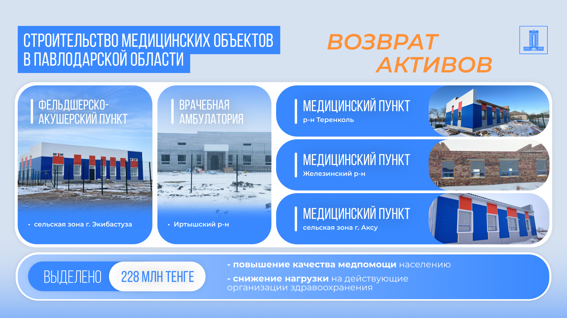Мемлекет басшысының тапсырмасына сәйкес, Үкімет елімізге қайтарылған заңсыз иемденілген активтер есебінен әлеуметтік жобаларды жүзеге асырып келеді. Павлодар облысында медициналық нысандар салуға Арнаулы мемлекеттік қордан 228 млн теңгеден астам қаржы бөлінді.