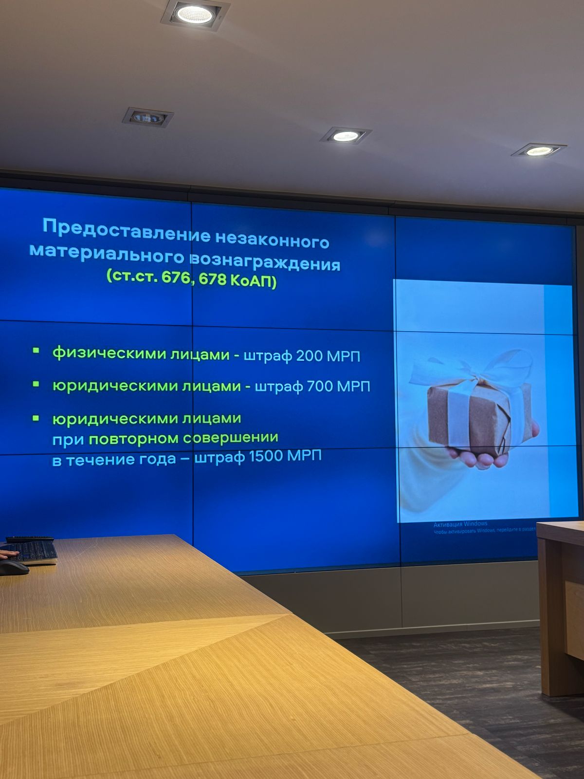 Комплаенс-офицер Е. Карасаев қызметкерлерге Қазақстан Республикасының сыбайлас жемқорлыққа қарсы заңнамасының негізгі ережелерін түсіндірді. Сондай-ақ, институттың ішкі реттеуші құжаттары егжей-тегжейлі қарастырылды, соның ішінде: