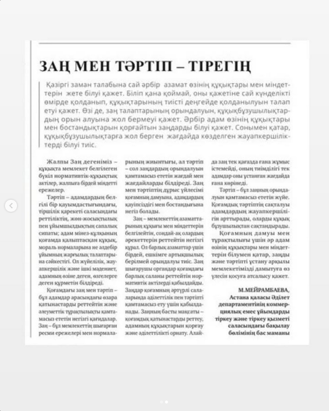 🔸«Astana Aqshamy» газетінде Астана қаласы Әділет департаментінің коммерциялық емес ұйымдарды тіркеу және тіркеу қызметі саласындағы бақылау бөлімінің бас маманы М.Мейрамбаеваның мақаласы жарияланды.