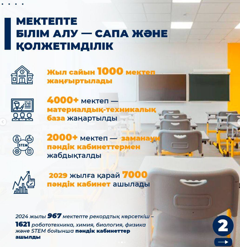 Соңғы үш жылда 4 мыңнан астам мектептің материалдық-техникалық базасы жаңартылды. 2 мыңнан астам білім беру ұйымында робототехника, химия, биология, физика және STEМ бойынша заманауи пәндік кабинеттер ашылды. Бір ғана 2024 жылдың қорытындысын алып қарар болсақ, 967 мектепте 1621 пәндік кабинет жабдықталды. Бұл бағыттағы жұмыстар әлі де жалғасуда, 2029 жылға қарай еліміздің мектептерінде кемінде 7000 заманауи пәндік кабинет ашу жоспарланған.