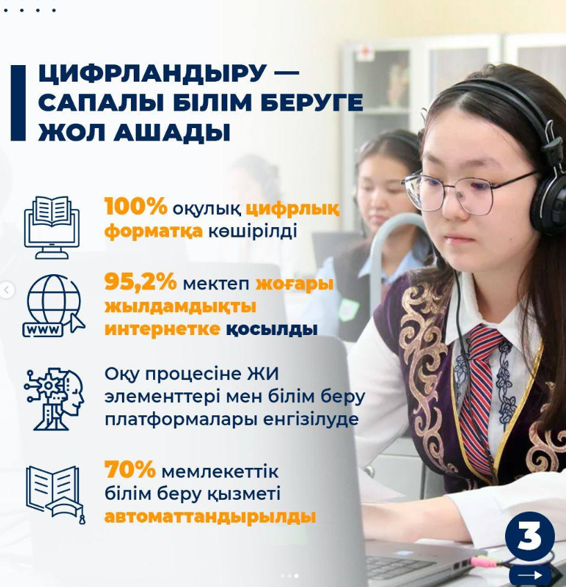 Білім беру сапасын арттырудың тағы бір маңызды факторы – цифрлық технологияларды енгізу болып табылады. Ұлттық бастамалар аясында мектеп оқулықтарының 100%-ы цифрлық форматқа көшірілді, ал мектептердің 95,2%-да жоғары жылдамдықты интернетке қолжетімділік айтарлықтай жақсарды. Білім беру платформалары енгізілуде, жасанды интеллект элементтері оқу процесіне интеграциялануда. Осы шаралардың барлығы оқушыларды болашақтың сын-қатерлеріне дайындауға және олардың бойында ерте жастан цифрлық дағдыларды қалыптастыруға бағытталған.